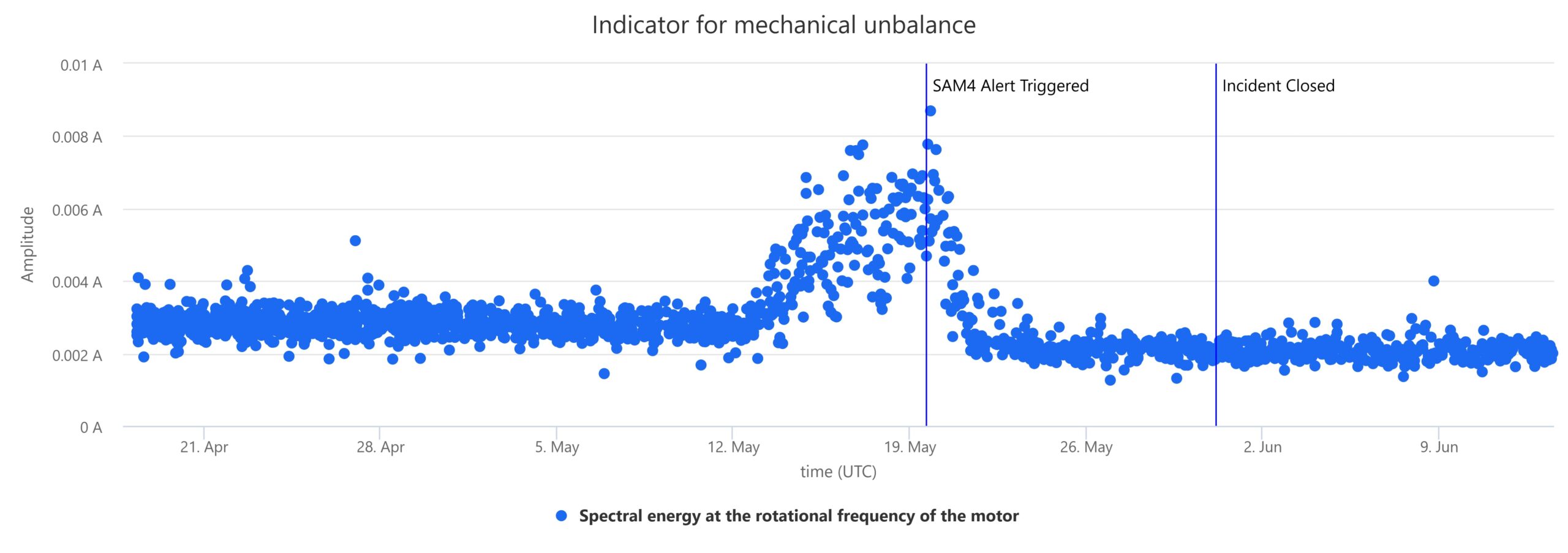 In May 2025, the SAM4 system detected early signs of mechanical unbalance in a critical motor. Thanks to that early warning and insights into the specific fault at hand, maintenance teams were able to investigate what was happening and address the specific issue (by replenishing the gearbox oil) before the issue escalated. The motor returned to normal behavior, without causing any unplanned downtime.