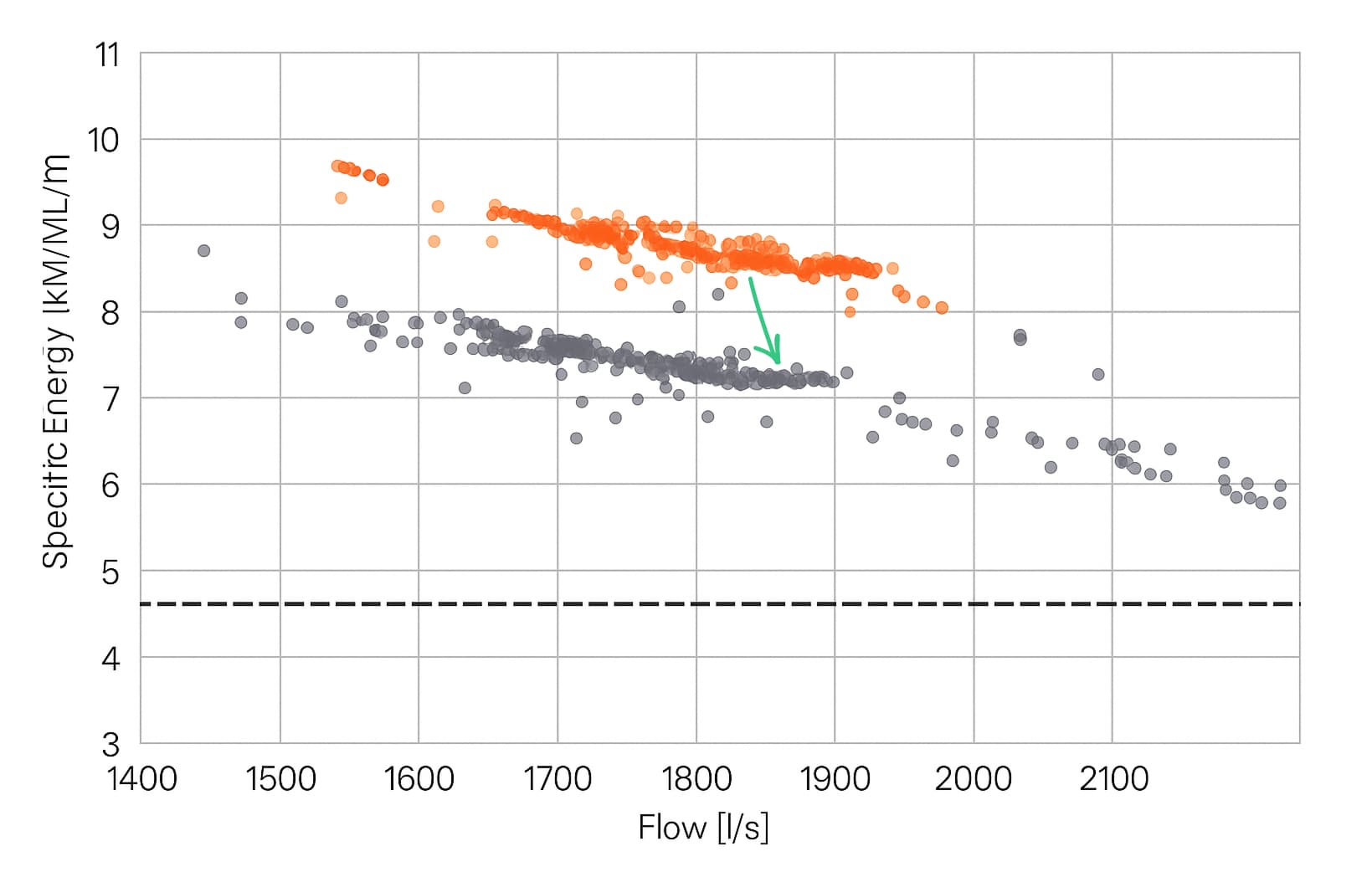Specifically, Samotics identified several opportunities to reduce energy use by improving how Sabesp operated its submersible pumps. One example was the discovery that using an updated set of pumps (labeled 1, 2, and 3) together achieved the required flow rates at a much lower specific energy consumption than the previously used combination of pumps 1, 2, and 4. Insights like this enable Sabesp to reduce its overall environmental impact while strengthening the reliability of critical, inaccessible assets.